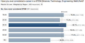 The other insights were not nearly as obvious. For instance, “Among men, those aged 35-44 picked No, have never considered STEM more than those aged 65+.” In fact, among men the 65+ crowd were the most likely to have considered a STEM career at some point.